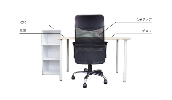 デスク・OAチェア・収納棚・インターネット回線・プロジェクター・ミーティングスペース・撮影ブース・ウォーターサーバー・冷蔵庫・電子レンジ